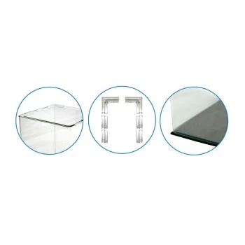 Neben dem Glasbecken erhalten Sie eine Abdeckscheibe sowie Halterungen und eine Unterlegmatte.