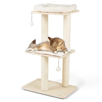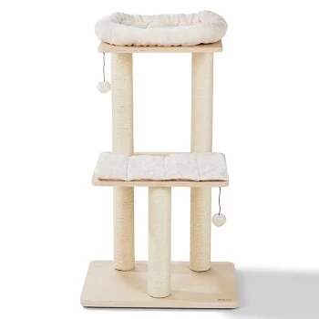 Alle Katzen haben ein natürliches Kratzbedürfnis und brauchen einen Ort für ihre Krallenpflege. Damit sich Ihre Katze gar nicht erst daran gewöhnt, ihre Krallen an Ihrem Mobiliar zu wetzen, bieten Sie ihr den AniOne Kratzbaum Lilly im modernen Holzdesign als perfekte Alternative. An den fünf Sisalstämmen kann ausgiebig gekratzt werden und Ihre Einrichtung bleibt vor Kratzspuren verschont. Die zwei Plüschbälle an elastischen Seilen sorgen für zusätzlichen Spielspaß. Der Kratzbaum von AniOne ist außerdem der ideale Rückzugsort. Die zwei Plattformen laden zum langen Verweilen und Entspannen ein. Das Plüschkissen und -Bettchen sind abnehmbar.