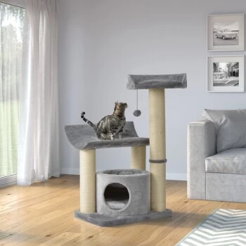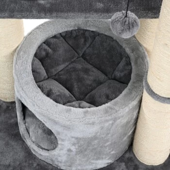 Mit dicken Säulen sorgt der AniOne Kratzbaum Phoebe für optimale Krallenpflege. Der Plüschball, welcher direkt am Kratzbaum befestigt ist garantiert jede Menge Spielspaß. Für Ruhephasen eignet sich sowohl das Innere der Höhle, die durch das herausnehmbare und waschbare Kissen zu einem bequemen Paradies wird als auch die komfortable Hängematte. Aufgrund der mehreren angebotenen Flächen kann der Kratzbaum auch in einem Mehrkatzenhaushalt genutzt werden.