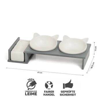 Katzennapf mit zwei Schalen mit „Kätzchenöhrchen“ und dritter Schale für z.B. Katzengras o. Trockenfutter aus Keramik mit Holz- oder Betonoptikständer