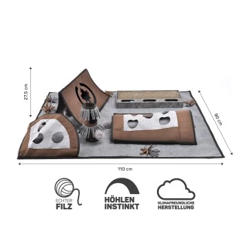 Lassen Sie Ihren vierbeinigen Liebling sich seine Leckereien verdienen. Verschiedenste Verstecke laden zum Suchen und Herumtollen ein. In jedem Tunnel, Turm oder Versteck sind Löcher eingelassen, sodass Ihre Katze mit der Pfote hindurch kommt und die integrierten Spielbüschel inkl. Glöckchen einfangen kann. Erleben Sie gemeinsame Stunden voller Spielspaß beim Kratzen, Suchen und Spielen. Fordern Sie Ihre Katze! Beschäftigung pur, durch aktives Spielen und Instinktförderung. Interaktives Spielen hat noch nie so viel Spaß gemacht! Und sollte mal nicht genügend Platz für den gesamten Spielteppich vorhanden sein, lässt sich das Kratzbrett inkl. Spielschiene vom Teppich lösen und einzeln verwenden. Noch nie wurde Ihrer Katze soviel auf nur einem Quadratmeter geboten!