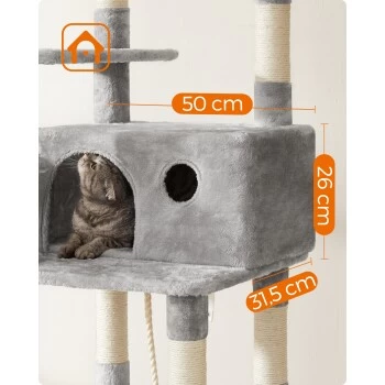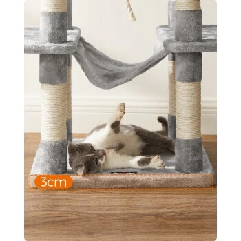 ALL-IN-ONE VERGNÜGUNGSPARK: Nickerchen machen, entspannen, dehnen, spielen… Dieser Kletterbaum bietet zahlreiche VIP-Services. Er verfügt über 2 große Plattformen, 1 Katzenhaus, 1 Hängematte, 1 Liegemulde, 3 Stäbe mit Fellbällchen und 1 Sisalseil