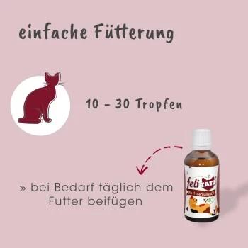 Durch den natürlichen Putzvorgang abgeschluckte Haare können Ihrer Katze zu schaffen machen. Sie kitzeln im Hals, blockieren den Magen oder wollen nicht recht durch den Darm. Mit feliTATZ Bio-HaarballenÖl bieten Sie Ihrer Katze die Möglichkeit, die abgeschluckten Haare besser durch ihren Verdauungstrakt zu schleusen und auszuscheiden.