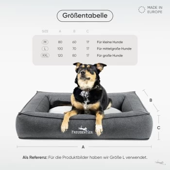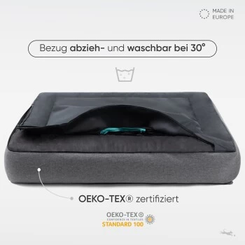Das orthopädische Hundebett „Siebenschläfer“ im eleganten Box Design ist mit atmungsaktiven & druckentlastenden Memory Foam Flocken gefüllt. Diese passen sich perfekt dem Körper deines Hundes an. Für die Liegefläche haben wir einen kuschelig weichen Stoff verwendet, der aber kurz genug ist, um Schmutz bestmöglich abweisen zu können. Der pflegeleichte Bezug ist zu dem bei 30 Grad waschbar. Das Hundebett ist in den folgenden Größen erhältlich: M = 80x60cm, L = 100x70cm & XXL = 120x80cm.
