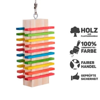 Papageienspielzeuge aus Holz wie dieses befriedigen den natürlichen Drang zu kauen und trimmen zugleich den Schnabel.