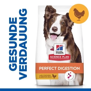 Hill’s Science Plan Perfect Digestion Adult 1+ Hundefutter mit Huhn und braunem Reis ist ein Alleinfuttermittel für erwachsene Hunde ab 1 Jahr.