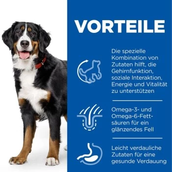 Dieses mit leicht verdaulichen Zutaten hergestellte Trockenfutter steckt voller Omega-3- und Omega-6-Fettsäuren, die bei Ihrem Seniorhund ein glänzendes Fell fördern. Die spezielle, exakt ausgewogene Kombination aus Zutaten unterstützt die Gehirnfunktion von älteren Tieren, ihre soziale Interaktion und ihr Energieniveau.
