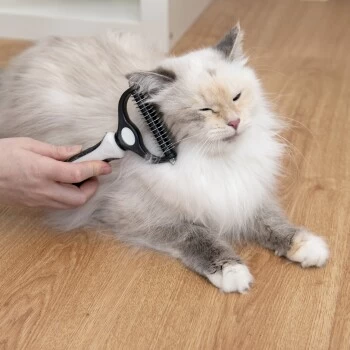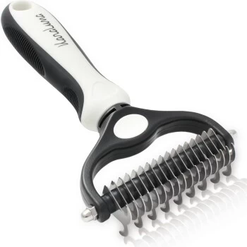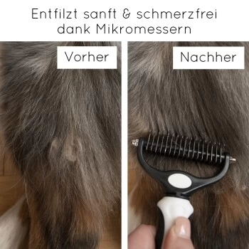 Die KaraLuna Fellbürste gleitet dank des abgerundeten Bürstenkopfs sanft durch das Fell. Sie entfernt dabei lose und verfilzte Unterwolle ganz ohne Ziepen. Mit Hilfe der feinen Klingen an der Innenseite wird verfilzte Unterwolle schmerzfrei und effizient herausgekämmt. Die feinen Klingen schonen das Deckhaar Deines Haustieres. Mit der KaraLuna Unterfellbürste wird das Entfernen von lästigen Verfilzungen somit zum Kinderspiel. Der extra breite Bürstenkopf entfernt lose und verfilzte Unterwolle besonders schnell. Die Hundebürste ist daher ideal für Mittel- und Langhaar Hunde. Der KaraLuna Entfilzungskamm verfügt über 9 + 17 Präzisionsklingen: 9 Klingen für besonders dichte und verfilzte Fellstellen; 17 Klingen für eine intensivere Pflege.