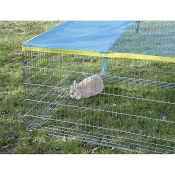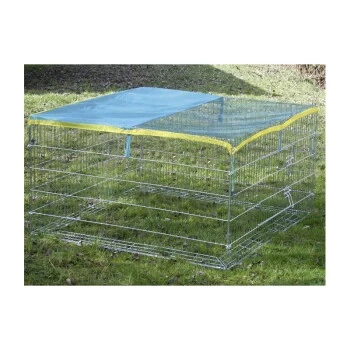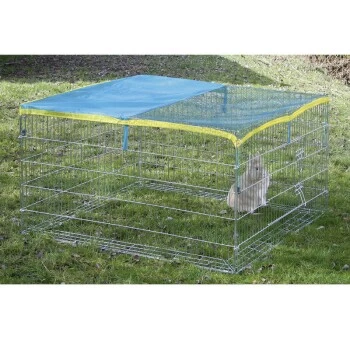 Das Gehege ist durch Erdspieße einfach zu montieren. Es hat ein Abdecknetz mit integriertem Sonnenschutz sowie eine seitliche Tür. Speziell für intensive Buddler ist das Freilaufgehege mit Ausbruchsperren gesichert.