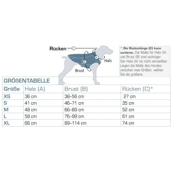 Messen Sie Ihren Hund vor der Bestellung ab. Sollte Ihr Hund zwischen zwei Größen liegen, nehmen Sie das größere Modell.