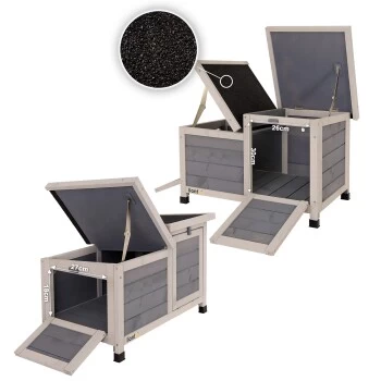 Dieses Nagerheim bietet einen überdachten Aufenthaltsort, in dem Ihre Nager und Kleintiere sich ausruhen und zurückziehen können. Die beiden wetterfesten und aufklappbaren Dächer mit Bitumenplatten sind ideal für die Nutzung im Garten oder auf dem Balkon geeignet. Die Klappfunktionen der Dächer ermöglichen einen schnellen Zugang zu Ihren Tieren und vereinfachen die Innenreinigung. Die beiden Klapptüren, die mit einem Schieber oben geschlossen werden können, dienen im geöffneten Zustand als Zugangsrampen für Ihre Tiere. So können die Nager beim Rennen und Toben zwei Zugänge nutzen.