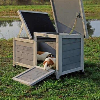 - ZWEI ZUGÄNGE. Ihr Liebling kann bei diesem Kleintierstall gleich zwei Eingänge nutzen, deren Klappen gleichzeitig als Zugangsrampen dienen