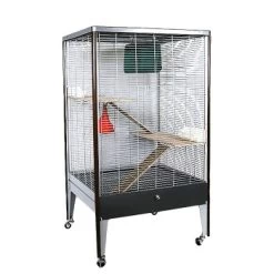 Montana Cages – Dieser superschöne Käfig bietet Ihrem Liebling ein perfektes Eigenheim! Wie von Montana cages gewohnt bietet es besonders viel Platz zum Klettern und Toben. Die Optik besticht durch eine besondere Kombination aus den beliebten Pulverbeschichtungsfarben Antik und Platinum sowie Eckprofile in Holzoptik. Durch eine größere und zwei kleine Türen hat man für die Fütterung und Reinigung einen guten Zugang zum Innenraum. Im unteren Bereich findet sich das Kotgitter und die Streuschublad