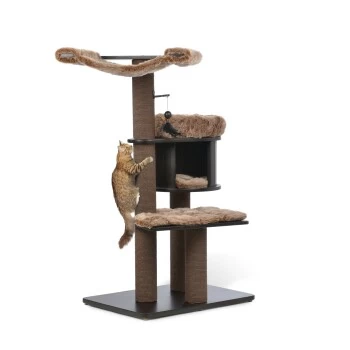 Der MORE Kratzbaum George eignet sich dank seiner großzügigen Liegeflächen ideal als Ruheoase und Spielwiese für große Katzen. Die weichen Liegekissen sind aus kuschelweichem und luxuriösem Plüsch gefertigt und lassen sich bei Bedarf leicht abnehmen und per Hand waschen. Die ca. 12cm breiten Kratzstämme sind mit robustem dunkelbraunem Seil umwickelt, was dem Kratzbaum seine edle Optik verleiht. Darüber hinaus bietet der MORE Kratzbaum George eine bequeme Hängematte sowie großzügige Höhle, sodass beim täglichen Beobachten und Entspannen sicherlich keine Langeweile aufkommt. Die Bodenplatte des Kratzbaums ist mit kleinen Gummifüßen ausgestattet und schützt so den Boden. Die eleganten dunkelbraunen Farbtöne und die qualitativ hochwertige Verarbeitung machen diesen Kratzbaum zu einem langfristigen Lieblingsstück von dir und deinem Stubentiger – dank der vielfältigen Möglichkeiten zum Spielen, Kratzen, Entspannen und Beobachten.