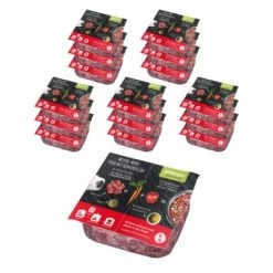 Das perfekte Menü, um groß und stark zu werden: Für Welpen und junge Hunde haben wir in unserer Produktreihe frisch und fertig ein BARF-Menü entwickelt, das genau auf die besonderen Bedürfnisse der heranwachsenden Vierbeiner abgestimmt ist. Das Premiumfutter liefert mit proteinreichem Rindfleisch die nötige Energie, die junge Hunde brauchen, um ausgiebig toben, rennen und spielen zu können. In der Kombination mit Hühnerhals erreicht das Welpen-Menü außerdem ein optimales Kalzium-Phosphor-Verhältnis – die Voraussetzung für ein gesundes Knochenwachstum. Karotte und Apfel decken den in der BARF-Fütterung erforderlichen Gemüse- und Obstanteil. Hochwertiges Öl macht das Frische-Menü komplett.