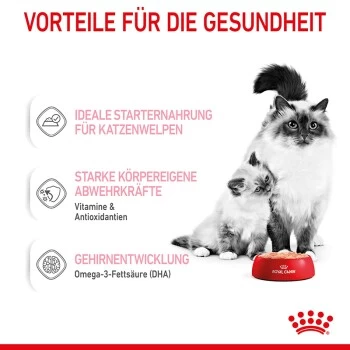 Zudem wird die Entwicklung der körpereigenen Abwehrkräfte von Katzenwelpen durch einen Nährstoffkomplex mit Vitamin E und C wissenschaftlich nachgewiesen unterstützt. - ROYAL CANIN Mother & Babycat ist außerdem angereichert mit einer Omega-3-Fettsäure (DHA) zur Unterstützung der Gehirnentwicklung und Förderung einer gesunden Sehkraft bei Katzenwelpen.