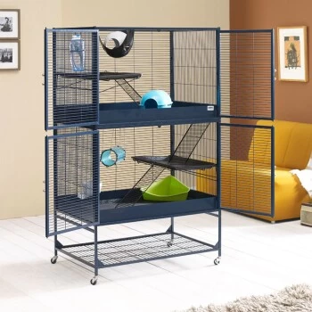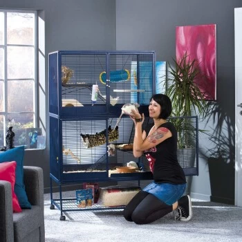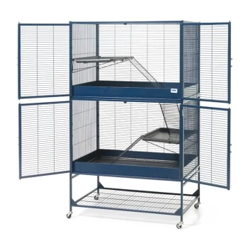 Der Käfig Royal Suite hat extra große Türen für einfaches Reinigen und Füttern sowie Stauraum für Futter, Streu etc. ausgestattet.