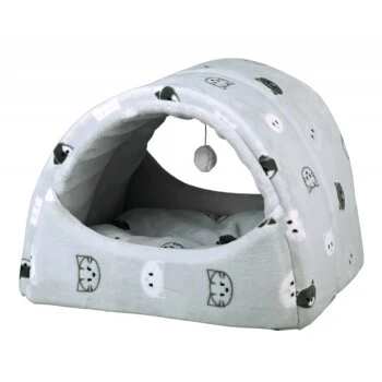 In der weichen Höhle können Katzen sich zurückziehen und spielen. Denn an der Decke ist ein Spielzeug am Band befestigt, welches zum Erkunden und Spielen einlädt.